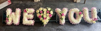 Each letter measures 14 inches in height and are edged in a ribbon colour of your preference. Rose corsages are added to each letter to compliment your ribbon edge.