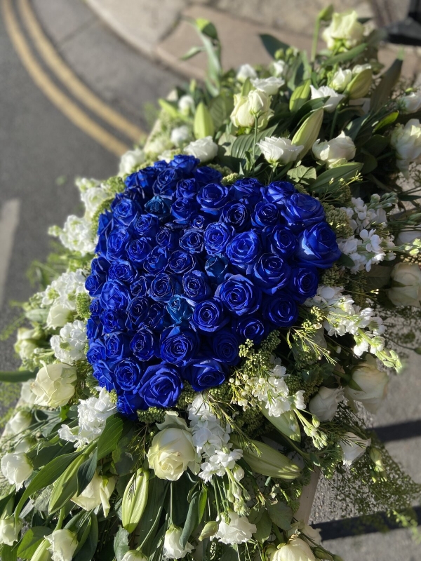 A beautiful blue rose heart surrounded around a collaboration of white roses, white lisianthus, white seasonal stems and green foliage.