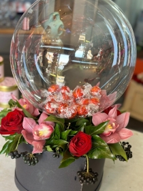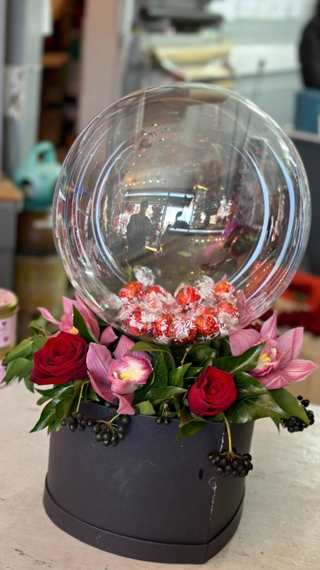 Seasonal stems in shades of reds and pinks arranged in a heart shaped hat box finished with a clear bubble balloon filled with lindt chocolates.