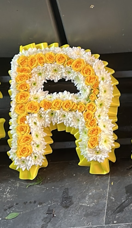 Each letters is lined with yellow roses and finished with White chrysanthemum is used to create the perfect tribute for your loved one.